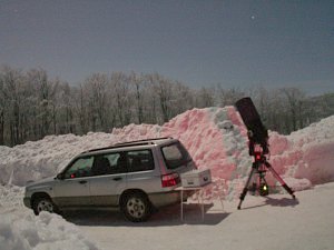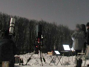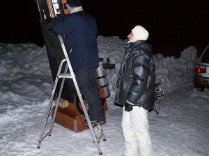 Zubehör. Ein Tisch ist unerlässlich, wenn Schnee liegt. Am Boden kann man nichts mehr abstellen. Wenn es feucht ist, Koffer immer schließen, sonst bildet sich überall eine Eisschicht. Nicht benötigte Okulare etc. immer verschließen. Sollten Tisch- und Stativbeine am Boden festfrieren, erweist sich etwas Auftaumittel im Gepäck als nützlich.
