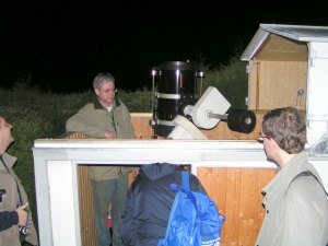 Wir nützen den schönen, aber vom Mond stark aufgehellten Abend zur Beobachtung bekannter Objekte, denn immerhin wollen wir die Leistung eines Preßberger-Teleskops einmal selbst erleben (vor vielen Jahren konnte ich den "Urvater" dieser Teleskope, das 100cm RC-Teleskop in Klosterneuburg, für Beobachtungen nützen, leider ist dieses Teleskop momentan nicht zugänglich und auch nicht betriebsbereit). Unser Urteil: Beeindruckend. Trotz des Mondlichts geben hellere Deep Sky Objekte wie M15, M57 oder M76, sehr viel her. Für den Mond ist das Instrument natürlich zu groß.