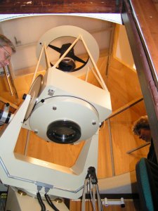 Das mechanische Design des Teleskops und seiner Montierung stammt vom leider schon verstorbenen Techniker des Instituts für Astronomie der Universität Wien, Ing. Rudolf Preßberger. Sein Geniestreich bestand darin, die größtmögliche Stabilität mit der kleinstmöglichen Instrumentenmasse zu kombinieren. Auf viele Teile, wie etwa komplizierte Getriebestufen, die bei vergleichbaren Teleskopen zu Betriebsstörungen führen können, kann in diesem Design daher verzichtet werden. Schade, daß dieses Instrumentendesign keine größere Verbreitung gefunden hat ... |