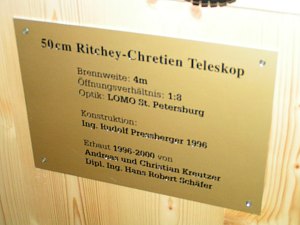 In einem Schutzbau, der nur unwesentlich größer ist als das Teleskop selbst, und der äußerlich sehr an die vier Riesenteleskope auf dem Cerro Paranal in Chile erinnert, steht das Prunkstück der Sternwarte, das 50cm RC-Teleskop. Seine Optik stammt von LOMO, dem bekannten Hersteller astronomischer Optiken aus St. Petersburg in Rußland. Der Tubus ist ein Serrurier-Gittertubus, wie er bei vielen Großteleskopen üblich ist. Mit einem Öffnungsverhältnis von f/8 ist das System auch sehr lichtstark, beeindruckend ist das verwertbare Bildfeld von 8 x 8 cm. Die derzeit eingesetzte, semiprofessionelle CCD-Kamera von Roper Scientific, nützt dieses enorme Feld natürlich noch nicht aus. |