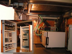 Der "Keller" des Schutzbaus ist voll mit den Steuercomputern für Teleskop und Kameras sowie den Kühlsystemen für die (klimatisierte!) Kuppel und die CCD-Kamera. Letztere wird mit Flüssigkeit gekühlt und als Kühlaggregat fungiert eine Tiefkühltruhe. Alles sieht hier wirklich extrem professionell aus - und ist es auch. |