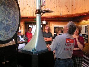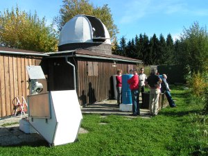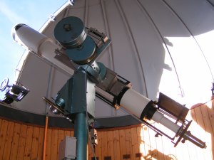 Die Kuppel der Sternwarte beherbergt einen Refraktor mit 20cm Fraunhofer-Objektiv. Er wird in erster Linie für Sternführungen bzw. für die Beobachtung von Mond und Planeten eingesetzt. Da das Fernrohr auf einer ziemlich hohen Säule montiert ist, bleibt in der Kuppel Platz für recht viele Personen - bei Führungen ein nicht unerheblicher Faktor. Allerdings ist der Aufstieg zum Okular nicht ganz ohne Abenteuer. | |
