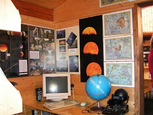 Vor kurzem fertiggestellt wurde der Erweiterungsbau der Sternwarte. Es handelt sich dabei um eine mächtige Rolldachhütte, die Platz für mehrere große Instrumente bietet. Auch diese Hütte ist eine Holzkonstruktion und sie wurde, wie auch der ältere Teil der Sternwarte, von den Mitgliedern des AAS selbst gebaut. Die kleine Kuppel im Hintergrund ist privat und gehört einem Mitglied des AAS. Vor kurzem hat der AAS das Grundstück, auf dem die Sternwarte steht, erworben. Ursprünglich war der Grund nur gepachtet. |