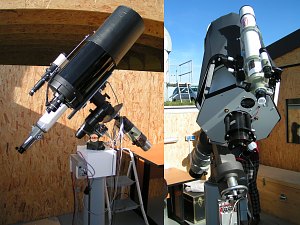 Derzeit stehen in der Rolldachhütte der 14" Hypergraf von Harald Strauß und ein weiteres, ebenfalls für fotografische Zwecke adaptiertes C8. Bei extremer Kälte können auch diese Instrumente aus einem geschossenen Raum aus bedient werden. Durch ein Fenster kann der Beobachter kontrollieren, ob das Instrument auch wirklich dort hin fährt, wohin es soll. | |
