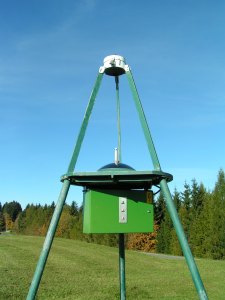 Etwas abseits der Sternwarte auf einer Wiese steht die berühmte, in erster Linie von Vereinsobmann Erwin Filimon betreute Meteorkamera. Mit ihr läßt sich (fast) der gesamte Himmel auf einmal abbilden und so die Spuren heller Meteore genau vermessen. |