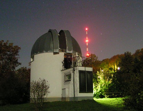 Der Mond strahlt hell vom Himmel, sodass bei der Beobachtung mit dem Hauptinstrument natürlich ein starker Mondfilter notwendig ist. Außerdem ist die Nacht angenehm mild und der Himmel, trotz der aus der Ferne düster wirkenden Smogglocke über der Stadt, recht klar. Aber wir sind ja hier auf dem Freinberg, doch gut 150m über der Stadt. |