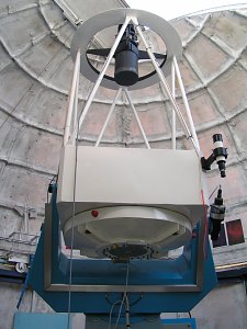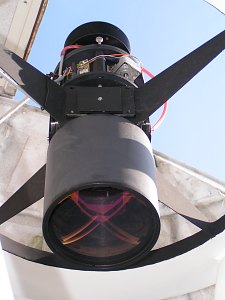 Was wie eine Fangspiegelhalterung aussieht, enthält lediglich die Korrektorlinsen des Deltagraphen, die für ein großes, ebenes Feld sorgen, und - am oberen Ende - die CCD-Kamera, mit der die Kleinplaneten fotografisch erfasst und anschließend vermessen werden. Erwin Obermair tauscht die CCD-Kamera gerne auch mit einer (analogen!) Mittelformat-Kamera aus, die Fotos, die er mit diesem enorm lichtstarken Instrument (60cm bei f/3.3) von Deep Sky Objekten macht, sind einsame Klasse! Das Bildfeld des Instruments ist so riesig, dass selbst der Andromedanebel spielend auf ein 6x9cm Negativ passt. |