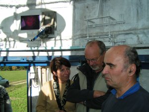 Auch hier in Davidschlag wurde alles, mit Ausnahme der Optik, selbst gebaut. Die Kuppel ist eine interessante Konstruktion aus einem Metallskelett und Polyester und erinnert teilweise an ein Boot. Beim Bau war wichtig, alles nur "provisorisch" zu errichten, denn ein fixer Bau durfte auf diesem landwirtschaftlichem Grund natürlich nicht errichtet werden. Unsere Sternwartenbauer lauschen vor allem bei Erwin Obermairs (im Bild vorne rechts) Schilderungen über den Fernrohrbau ganz genau. |