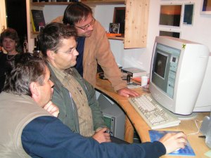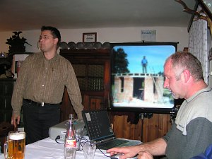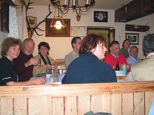 Unsere Gastgeber verwöhnen uns enorm; nicht nur, dass wir ihre Sternwarte besuchen dürfen, sie haben Unterkunft und Verpflegung für uns vor Ort organisiert. Bei einem rustikalen Abendessen, wie es sich im rauhen Hochland des Mühlviertels gehört, präsentieren sie uns in einem packenden Vortrag den Werdegang dieser neuen, modernen Sternwarte. Prof. Wöss ist ebenfalls anwesend, und da auch eine kleine Delegation vom Hochbärneck da ist, können gleich fünf Sternwartenerrichter Erfahrungen austauschen. Eine Idee für die Zukunft - der Sternwartenbauerworkshop in Sandl?