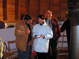 Die Kuppelkonstruktion ist ein echter Hammer. Wunderschön und exakt gebaut, eine wirkliche Augenweide. Das beeindruckt auch andere Sternwartenbesitzer wie Prof. Wöss (im Bild rechts, zur Kuppel blickend) und Christine Bretschneider. Einmal mehr werden viele Erfahrungen ausgetauscht. |