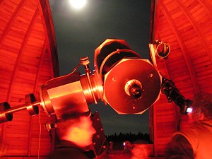 Dann heißt es "Licht aus", zumindest für das weiße Licht (und schon gar für Herbert Csadeks gnadenlosen Filmscheinwerfer). Obwohl das Rotlicht bei dem hellen Mond wohl eher paradox erscheint. Wir beobachten den Mond, obwohl der Terminator schon sehr weit zum Mondrand gerutscht ist. Einige, wie hier Günther Eder, versuchen sich auch bei ein paar Fotos. Schließlich kommen auch noch ein paar Deep Sky Objekte an die Reihe, die durchaus gut aussehen, trotz Mondlichts. Ein Kugelsternhaufen (M13) speziell für Renate, dann planetarische Nebel. Nur Galaxien gehen heute wirklich nicht. |