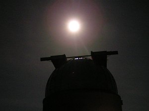 Mehr und mehr verteilen wir uns über das ganze Gebäude, immer noch wird beobachtet. Der helle Mond über der Sternwarte ist aber doch das beste Fotomotiv, und so begebe ich mich noch einmal ins Freie. |