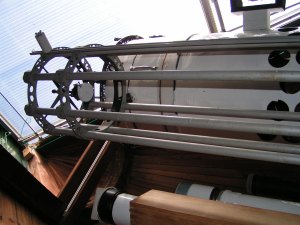 Auf der selbst errichteten Gabelmontierung sitzen nicht weniger als acht Teleskope, darunter eben der 50cm- und ein weiterer 30cm-Spiegel. Die Optiken: Selbstverständlich selbst geschliffen. Und noch ein Instrument fällt auf: Ein 60mm Spektiv von Nickel! In den 70er-Jahren wurde dieses, eigentlich nur für terrestrische Anwendungen konzipierte, ausziehbare Fernrohr allen Ernstes in Österreich als "das" Einsteigerfernrohr für Amateure gepriesen. Tempora mutantur ... |