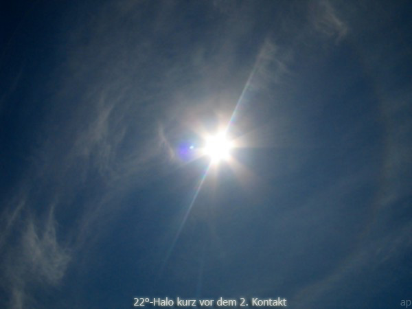 Wenige Minuten vor dem 2. Kontakt wurde das Licht eigenartig fahl, fast rötlich. Dann plötzlich der Aufschrei "Halo". Die Cirren waren da, tausende Eiskristalle brachen das Licht der kaum noch erkennbaren dünnen Sonnensichel und erzeugten einen prächtigen Halo, erstaunlich.