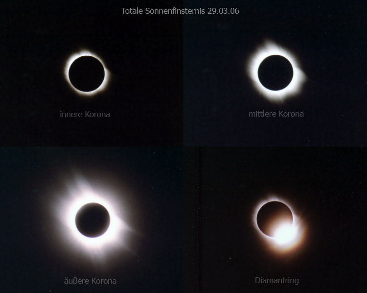 Dann der große Moment, der Mond schob sich komplett vor die Sonne und die wunderschöne Korona wurde sichtbar. Die Eindrücke, die während der nun 3:45 Minuten auf mich wirkten, sind kaum beschreibbar. Ich hatte Mühe, meine Fotos zu schießen, war einfach zu überwältigt. Eine streifenförmige Minimumskorona ist offensichtlich viel beeindruckender als eine helle kugelförmige Maximumskorona (1999). Dann der 3. Kontakt, hell erstrahlte der Diamantring, einfach grandios.