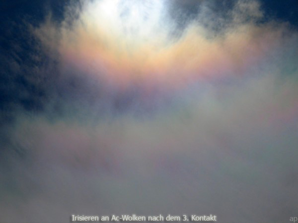Wir hatten Glück gehabt, etwas westlich der nun zunehmenden Sonnensichel konnte ich ein Altocumulus-Feld erkennen, welches rasch näherkam, sich vor die schmale Sonne schob und Wahnsinn, das Wolkenfeld begann in den schillerndsten Farben zu irisieren. Ein würdiger Abschluss für dieses tolle Ereignis.