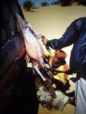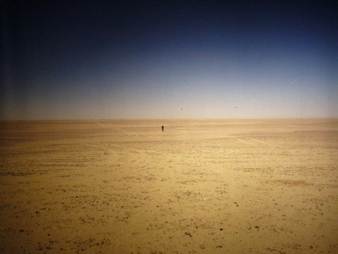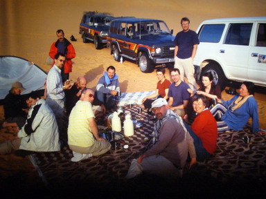 Schon beim Hinflug sehen wir am an Backbord auftauchenden Ätna, daß der Pilot brav auf Kurs ist, und Tripolis nicht mehr weit. Doris' "Kuschel-Schaf" fällt gleich am ersten Tag unserem Protein-Bedarf zum Opfer. Der Vulkan Waw-an-Namus (zu deutsch: "Mückenloch") macht seinem Namen alle Ehre. Endlich an der Zentrallinie angekommen. Hier ist die Sahara derart lebensfeindlich, daß sich nicht mal mehr die sonst überall in Afrika in Massen herum schwirrenden Fliegen hertrauen. Am Mars oder Merkur kann's trockener und toter nicht sein. Die Notdurftverrichtung ist für uns in dem offenen und deckungslosen Gelände ein bissal ungewohnt. Tag der Sonnenfinsternis. Ran an die Geschütze, hoch die Rohre! Auf der Rückfahrt von einer makellosen Sonnenfinsternis mit über 4-minütiger Totalität will uns der Vordermann unser inzwischen gewohntes Bad in der Staubwolke mal wieder nicht vorenthalten.