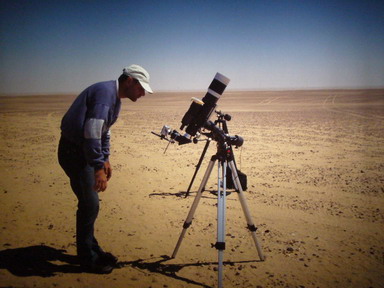 Beim gemütlichen Beisammensitzen neben einer rund 70m hohen Düne schwärmt unsere Reiseleiterin Christine von Astronomie im allgemeinen und von Roten Riesen, dem Schmuckkästchen (Kappa Crucis) und der Präzession im besonderen. Ich erkläre ihr mit meinem Laser-Pointer den Sternenhimmel, den sie "unpackboa" findet... Neben der Sonnenfinsternis und dem Neulicht fallen uns Omega Centauri, Kappa Crucis, Eta Carinae und Centaurus A als astronomische High Lights besonders ins Auge, die wir mit unseren maximal 4-zölligen Geräten beobachten, so gut es eben geht. Wenn diese lieben Tierchen auftauchen, verbietet sich eine Kuschel-Nacht unter dem romantischen Wüstensternenhimmel. Jetzt wissen wir, wozu wir Zelte mitgebracht haben. Unsere Reise wird immer wieder durch Biesel- und Gebetspausen...