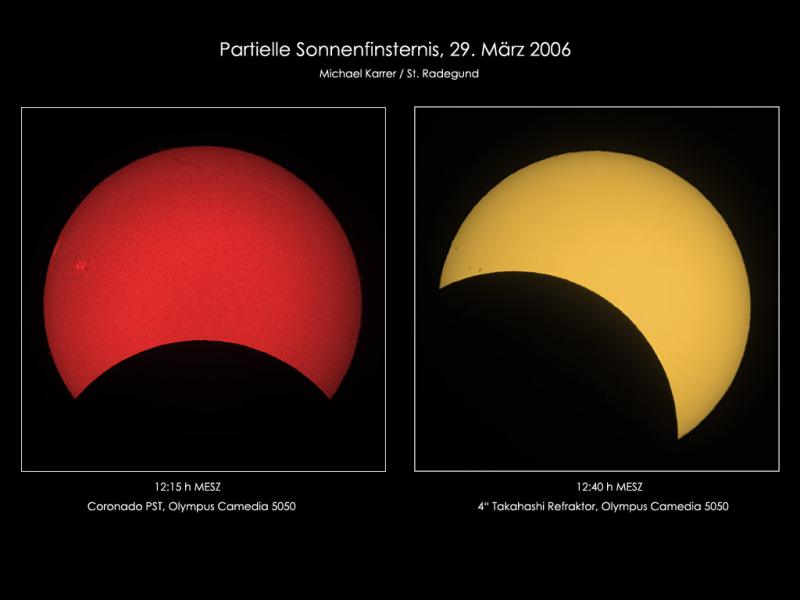 Bericht: | die meteorologen behielten recht: regentropfen bei tagesanbruch, erste blaue lücken am vormittag und kurz vor beginn der finsternis ein aufgelockerter himmel. mir schien das rinnegger plateau sogar wetterbegünstigt, dicke wolken machten einen weiten bogen. fast überraschend eine kleine fleckengruppe, aber wie erwartet nur kleine protuberanzen. eine leichte lichtdämpfung zu finsternismitte war merkbar. erstmals konnte ich Halpha und weißlicht vergleichen. das war auch schon das einzig wirklich interessante an dieser finsternis für mich. mit etwas wehmut, diesmal nicht dabei sein zu können, erhaschte ich einen TV liveblick über das verfinsterte küstengebiet der türkei. |