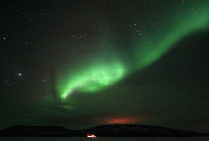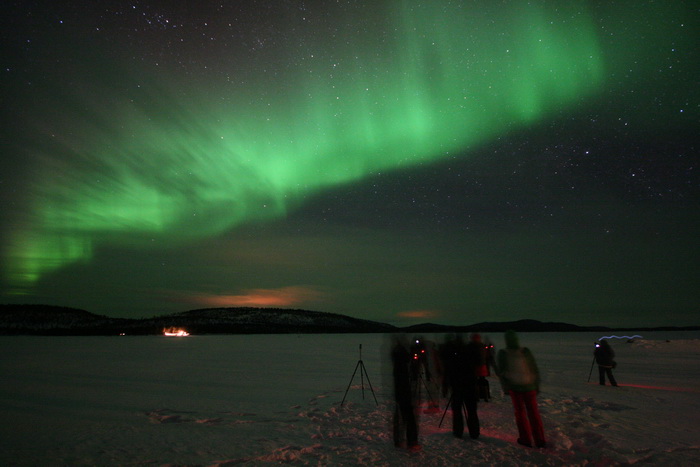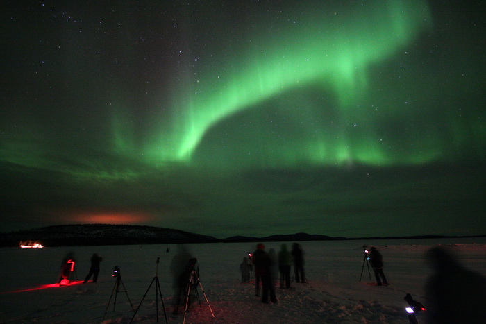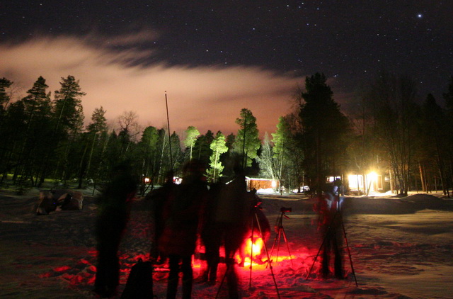 Wir sind gerade erst in Ukonjärvi, weit nördlich des Polarkreises angekommen. Haben unser Quartier bezogen und zu Abend gegessen. Da klart der Himmel auf und uns erwartet die erste Beobachtungsnacht für Polarlichter. Das ist nicht der offizielle Reisebericht, sondern ein ganz persönlicher Eindruck von dieser Nacht. Ich hatte zweimal in Österreich ein Polarlicht gesehen; in Mitteleuropa ist das ein weniger spektakuläres Ereignis. Der Himmel im Norden färbt sich rötlich, das war's dann auch. Wie würde das hier sein? Würden wir heute ein Polarlicht sehen? Die Prognosen sind nicht so schlecht, aber noch sehr unsicher. Unsere Gruppe von Fotografen bezieht bei frischen -13°C Position auf dem Eis des zugefrorenen Ukonjärvi, einem Teil des riesigen Inarijärvi.