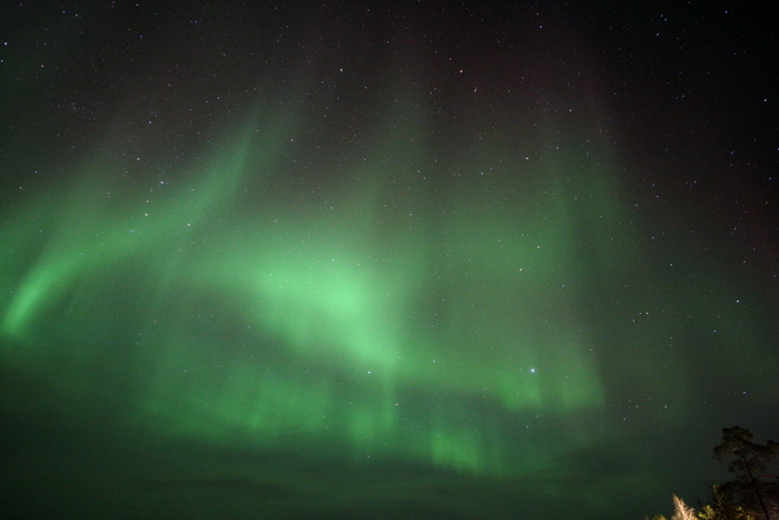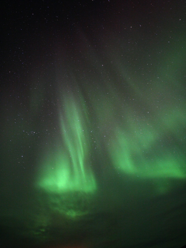Wir können nicht ahnen, dass dies unsere wärmste (!) Beobachtungsnacht werden würde ... Ich kenne die Polarlichter im Hohen Norden nur von Fotos und von Schilderungen, und die sind widersprüchlich. Doch da taucht ein erster Schimmer auf. Andreas Pfoser erklärt, dass das wirklich ein Polarlicht ist. Erste Fotos. Grün. Nett. Doch dann -- dann geht es erst richtig los!
