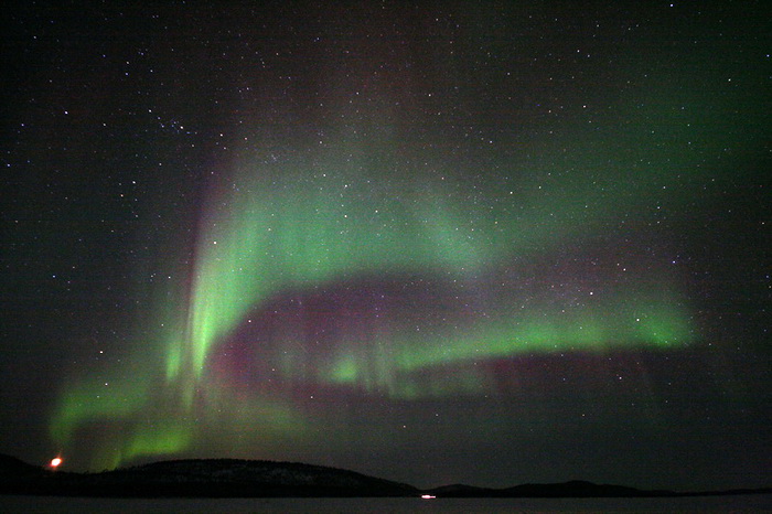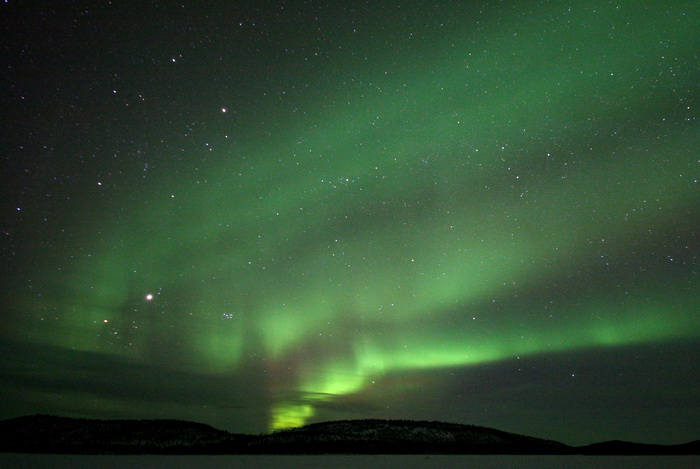 Nachdem die Prognosen eher schwaches Polarlicht voraussagen, lassen wir uns Zeit den Beobachtungsplatz aufzusuchen zumal es extrem kalt ist. Am See liegt die Temperatur bereits im Bereich von minus 27 Grad. Erst gegen 23 Uhr gehen wir hinunter. Wie in den letzten Tagen erstreckt sich der Polarlichtbogen von NW nach NO mit deutlich höherer Aktivität im westlichen Teil. Visuell sind es zarte Lichtschleier mit einem Hauch von Grün, das auf den Fotografien in sattem Hellgrün erscheint.