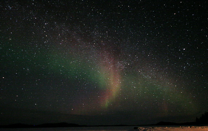 Nur mit Polarlichtern sieht es heute eher dürftig aus. Hauptsächlich in Richtung Norden zeigen sich schwache Schleier, die man nur mit der Kamera von Wolken der Milchstraße unterscheiden kann, Dafür stecken aber alle für Polarlichter mögliche Farben in ihnen.