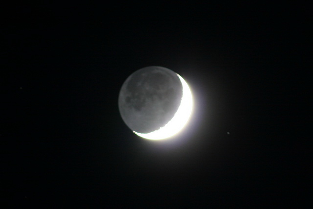 Der Nachmittag dient dem Müßiggang, bevor es dann in der Abenddämmerung zur Kometenjagd geht. Bei PanSTARRS sind wir wieder erfolglos, aber dafür gibt es ein anderes Erfolgserlebnis. Es gelingt uns eine Sichtung des Neulichts. Der Mond ist nur 21 Stunden alt. Recht rekordverdächtig für diese geographische Breite. Freisichtig gelingt es mir nicht die wirklich nur hauchdünne Mondsichel wahrzunehmen, doch als ich in die Aufnahmen hinein zoome, ist sie deutlich erkennbar.