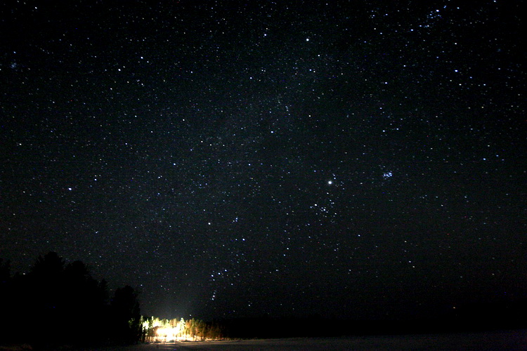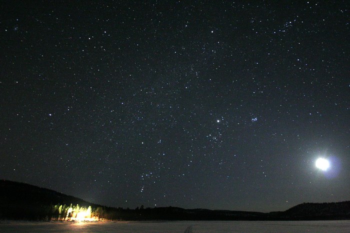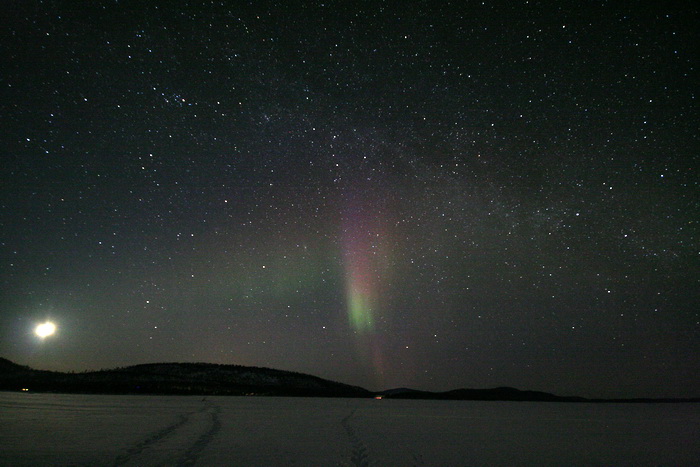Beim Abendessen gibt es dann wieder Andreas Bericht über Wetter und zu erwartende Polarlichtaktivität. Vom Wetter her gesehen wird es zapfig. Bei klarem Himmel werden so ca. minus 25 erwartet, dafür ist aber mit keiner stärkeren Polarlichtaktivität zu rechnen. Vor dem Ausrücken auf den Beobachtungsplatz lege ich daher noch eine zusätzliche Schicht in Form von Angorawäsche auf. Als ich gegen 22 Uhr zum Beobachtungsplatz komme, ist die Milchstraße fast heller als das schwach leuchtende Polarlicht. Aber was heute an Polarlicht fehlt macht der Himmel wett. Eine freisichtige Grenzgröße von 7 mag bei bester Transparenz, das kenne ich sonst nur aus Namibia und das liegt mit 1800m deutlich höher. Wann kann man schon im untergehenden Orion M42 freisichtig knapp über dem Horizont beobachten? So ist jedenfalls für mich dieser Beobachtungsabend vor allem durch einen visuellen Streifzug über den Himmel gekennzeichnet. Die ca. 20° Grad Differenz in der geographischen Breite wirken sich merkbar aus. So ist z.B. der Schwan zirkumpolar und steht tief im Osten. Endlich kann ich wieder einmal auch den kleinen Wagen problemlos zur Gänze sehen und all die Sterne dieses Sternbildes, die wir so gerne zur Bestimmung der Grenzgröße verwenden.