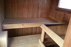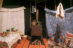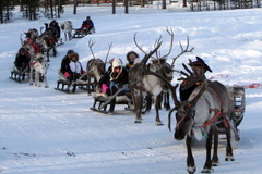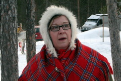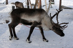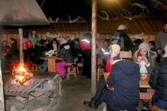 Eine knapp halbstündige Autobusfahrt bringt uns zu einer Rentierfarm, wo es nach einer kurzen Unterrichtung über Rentiere die Möglichkeit gibt Rentierschlitten zu fahren, nach Meinung mancher von uns die lappländische Art des Wiener Ringelspielfahrens. Die Farmerfamilie bewirtet uns zum Abschluß unseres Besuches mit Tee und Kaffee in einer Hütte bei offenem Feuer, wo uns dann noch unter Begleitung auf einer Trommel aus Rentierhaut einheimischer Gesang dargeboten wird. Vor der Hütte steht etwas im Wald das aussieht wie ein etwas zu groß geratenes Vogelhäuschen mit Treppe. Unsere Neugier wird befriedigt. Bei diesem seltsamen Ding handelt es sich um eine Vorratskammer für Lebensmittel. Wer braucht in Lappland schon einen Tiefkühlschrank. Dann geht es wieder zurück ins Ukonjärvi Holliday Village.