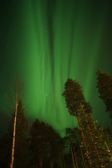 So um Mitternacht macht sich dann doch die Kälte bemerkbar und ich lege mit Franz eine Aufwärmpause mit heißem Tee in unserer Hütte ein. Als wir dann so gegen ein Uhr wieder hinaus in die Nacht treten und zum Beobachtungsplatz am See hinuntergehen, kommen wir nicht sehr weit. Das über unseren Köpfen fast im Zenit stehende Polarlicht nimmt plötzlich derart an Intensität zu, daß wir keine Sekunde mehr verlieren wollen und die Kameras aufstellen und fotografieren. Das hat auch einen Vorteil, denn die Bäume am Gelände geben einen sehr attraktiven Vordergrund ab.