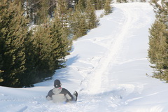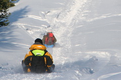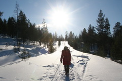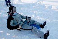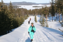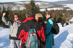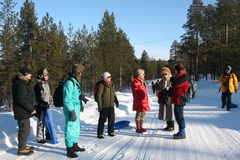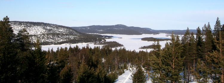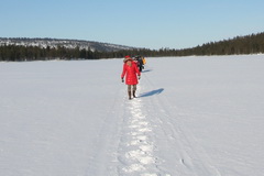 [Die Wanderung auf den Aussichtspunkt ist angesichts der Kälte und der Schneelage gar nicht unbeschwerlich, aber sehr lohnend, der Blick auf den zugefrorenen Ukonjärvi überwältigend. Zum Abschluss veranstalten Andreas, Ulrike und Thomas noch ein kleines Bobrennen, doch bei dem pulvrigen Schnee kommt kein allzu grosses Tempo auf. -- APi]