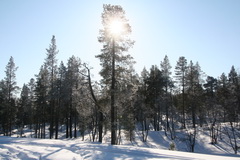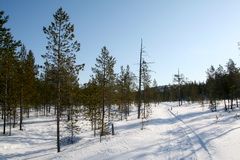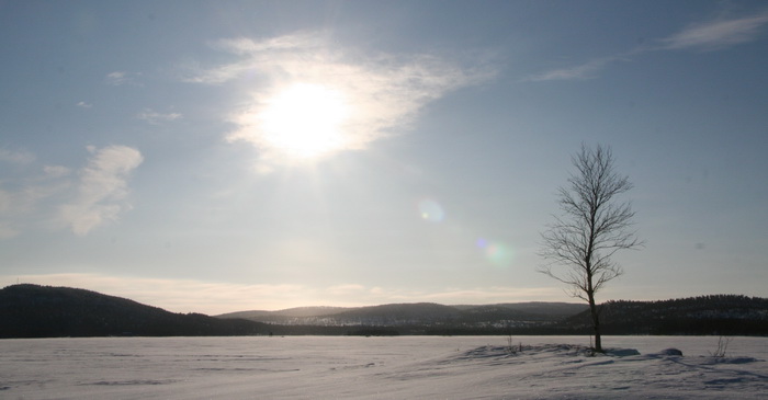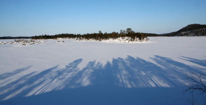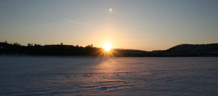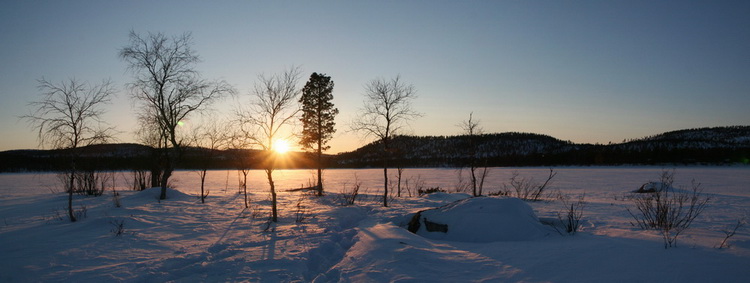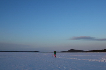 Franz und ich unternehmen eine Wanderung zu einem kleinen See. Von dort marschieren wir weiter über eine Loipe durch den Wald und dann über den zugefrorenen Ukonjärvi und unseren Beobachtungsplatz zurück ins Feriendorf. Diese Wanderung führt deutlich den Unterschied zwischen Winter in österreich und Winter in Lappland vor Augen. Anfang März, in Mitteleuropa kommen schon die ersten zarten Vorboten des Frühlings, hat es hier auch tagsüber deutliche Minusgrade, der trockene Schnee knirscht unter den Sohlen, von Schneeschmelze noch keine Spur und die Sonne steht so tief wie in unseren Breiten im Dezember. So ungefähr läßt es sich erahnen, wie finster, kalt und unwirtlich es hier in den Monaten Dezember und Jänner sein muß.