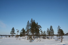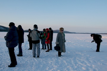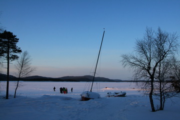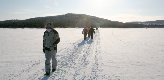 [Eine kleine Gruppe, die nicht an der Huskytour teilnimmt, unternimmt inzwischen eine Wanderung über den zugefrorenen Ukonjärvi zu einer kleinen Insel.]