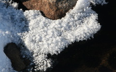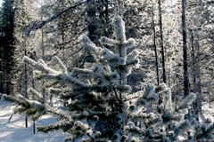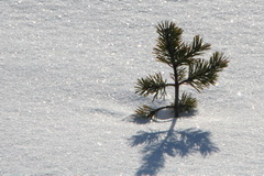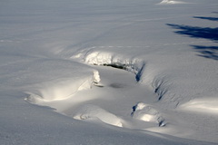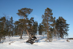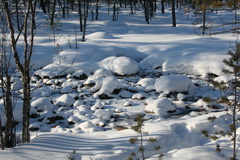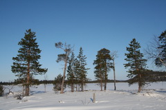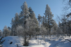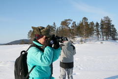 Die auf heute vorverlegte Schlittenfahrt mit Huskies wird im letzten Augenblick doch wieder auf morgen verschoben und so nützen wir das schöne aber kalte Wetter für eine längere Wanderung über einen kleinen zugefrorenen See und dann hinein in die lappländischen Wälder. Wälder sind hier nicht das gleiche wie bei uns. Sie bestehen hauptsächlich aus eher kleinwüchsigen Kiefern durchsetzt von Birken. Auch die Bewuchsdichte ist viel dünner als in unseren Wäldern. Durchsetzt ist das Ganze noch mit diversem Strauchwerk. Abgesehen von dem von uns benützten Weg gibt es keine Spuren von Zivilisation im Schnee. Nur vereinzelte Tierspuren durchziehen das unberührte Weiß. Wir kommen an einen kleinen Bachlauf, der erstaunlicherweise nicht zugefroren ist. Trotz der Kälte für mich ein Zeichen, daß wir uns gerade noch in der "habitablen Zone" befinden. Einen ganz besonderen Reiz, vor allem für die Fotografen, üben die verschiedenen Formungen in der Schneedecke aus. Die Natur mit ihrem Formenreichtum schlägt da jeden Künstler.
