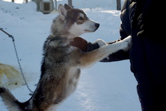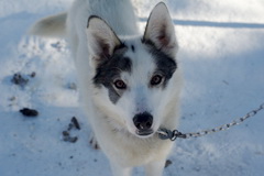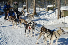 20 Teilnehmer unserer Gruppe brechen dann auf, um mit Huskyschlitten durch die Landschaft Lapplands zu streifen. Nach einer kurzen Einschulung in den Umgang mit dem Schlitten und Einkleidung mit dicken schützenden Overalls bricht die erste Gruppe zu einer rund 2,5-stündigen Rundfahrt auf. Währenddessen verbleibt die 2. Gruppe auf der Huskyzucht bei Tee und Kaffee. Ich nütze die Wartezeit, um etwas durch das Gelände zu streifen, wo die Hunde untergebracht sind. Jeder Hund hat seine eigene Hütte, vor der er angekettet ist und sich in einem Kreis von ca. 4-5 m Durchmesser bewegen kann. Die Hunde als bloß freundlich zu bezeichnen wäre stark untertrieben. Nach einem vorsichtigen Beschnuppern von wenigen Sekunden beginnt eine nicht mehr enden wollende Welle an Liebesbezeugungen, angefangen mit der Umarmung mit den Pfoten, dem Hinaufspringen bis hin zu regelrechten Schmuseattacken.