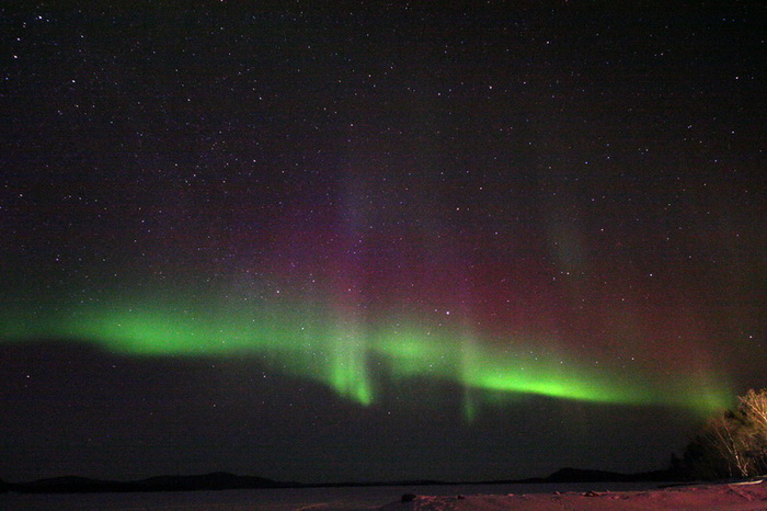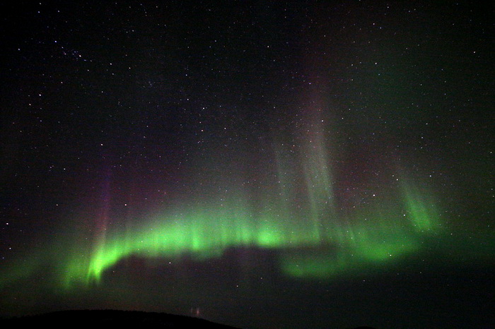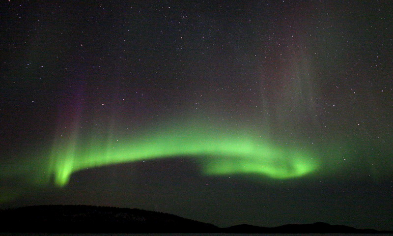 Die heutige Nacht wird nur unwesentlich "wärmer" als jene zuvor, doch jetzt bin ich noch besser auf diese Bedingungen eingestellt. Soll heissen: Die Kamera ist in einen dicken Wollsocken eingewickelt! Der Himmel ist toll, und auch heute Nacht gibt es Polarlichter. Sechste Nacht, sechste Beobachtung. Nicht schlecht.