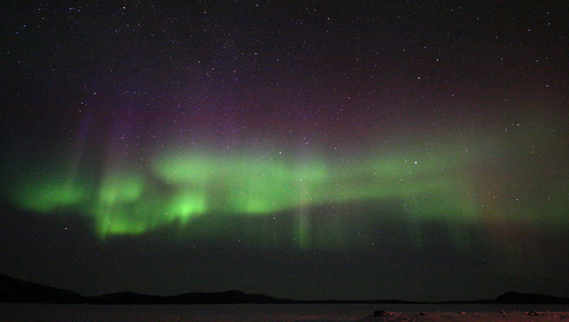 Gegen Mitternacht sinkt die Polarlichtaktivität gegen Null. Ein angekündigter Teilchenschauer aus einem Coronalen Loch bleibt aus. Eine Weile harren wir auf dem Eis aus (dabei zeigt sich, dass auf einem Bein stehen gut ist gegen etwaiges Frieren in den Füßen). Was zu folgender Beschreibung führt: "In Lappland in der Nacht, bei unter -30°C, auf einem zugefrorenen See auf einem Bein stehen, in den Himmel starren und auf ein Loch warten ..." - wer traut sich das ausserhalb des Kontexts zuzugeben? Fortsetzung folgt ... |