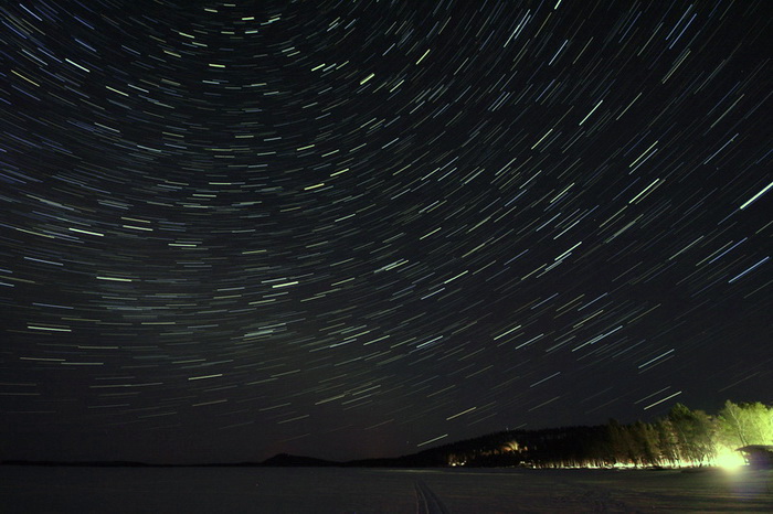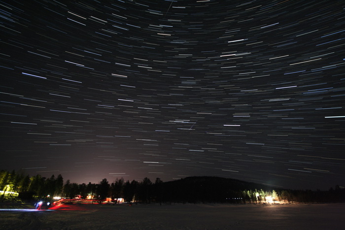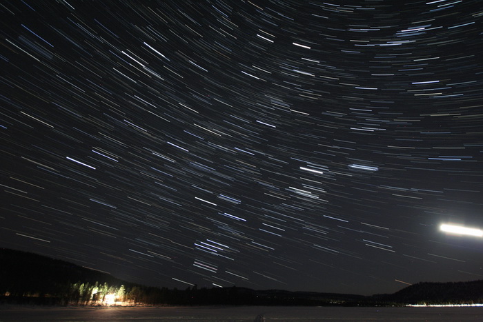 Ob die Akkus der Kamera lange genug halten werden, um die ungewöhnlichen Tagesbahnen der Gestirne mit Strichspuraufnahmen zu dokumentieren? Sie halten, was angesichts der dritten Nacht unter -30°C schon erstaunlich ist.