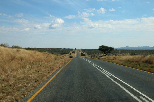 Zwei Zwischenstopps in Windhoek, wir müssen uns der Rundreisegruppe anschließen und in einem Supermarkt Vorräte für eine Woche einkaufen. Dann geht es weiter zur Farm. Wenige Kilometer nach der Stadtgrenze endet die Asphaltstraße und die restlichen rund 150 Kilometer geht es auf Schotterpiste.