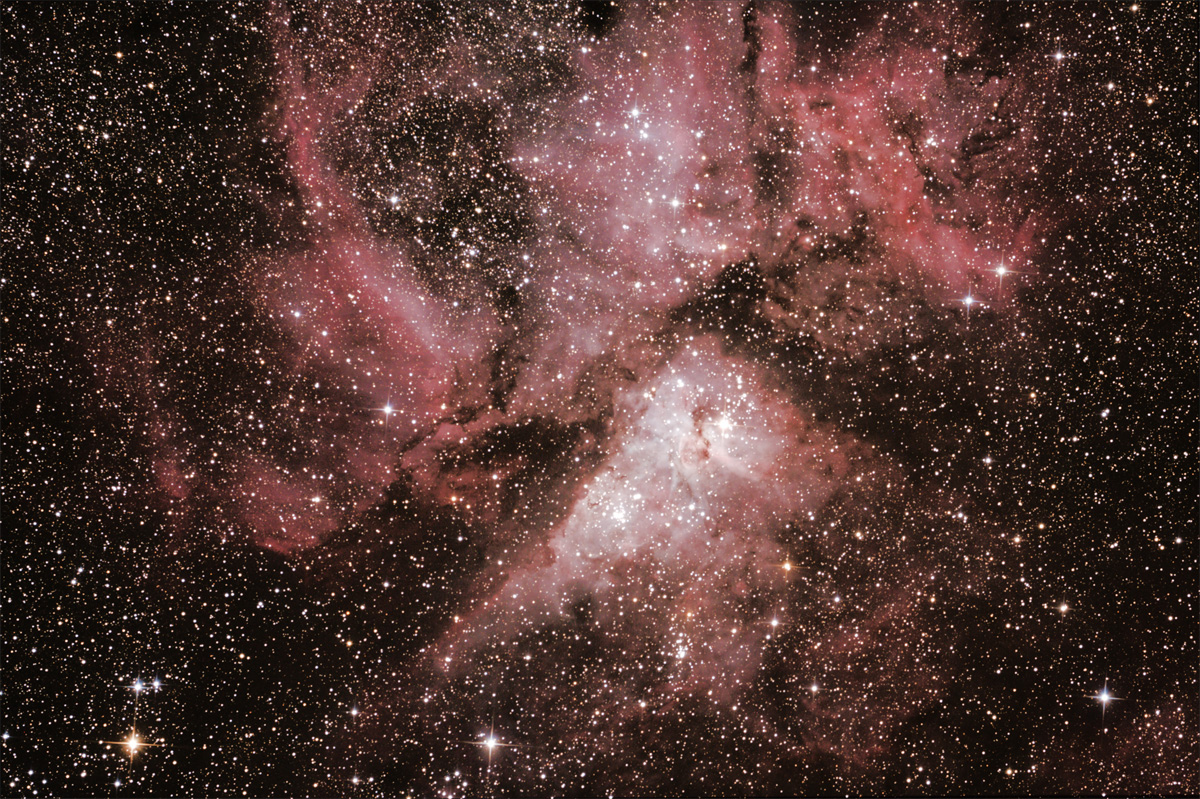 Der Stern η Carinae ist ein Stern in einem sehr späten Entwicklungsstadium und stößt laufend Hüllen ab. Diese sind als Homunculus-Nebel im Fernrohr bei sehr hoher Vergrößerung zu sehen, aber für diese fotografische Konfiguration viel zu klein.
