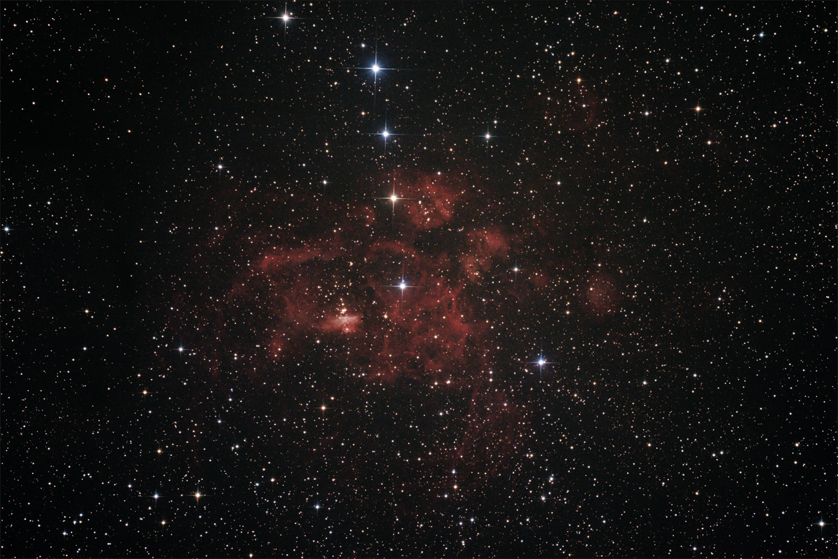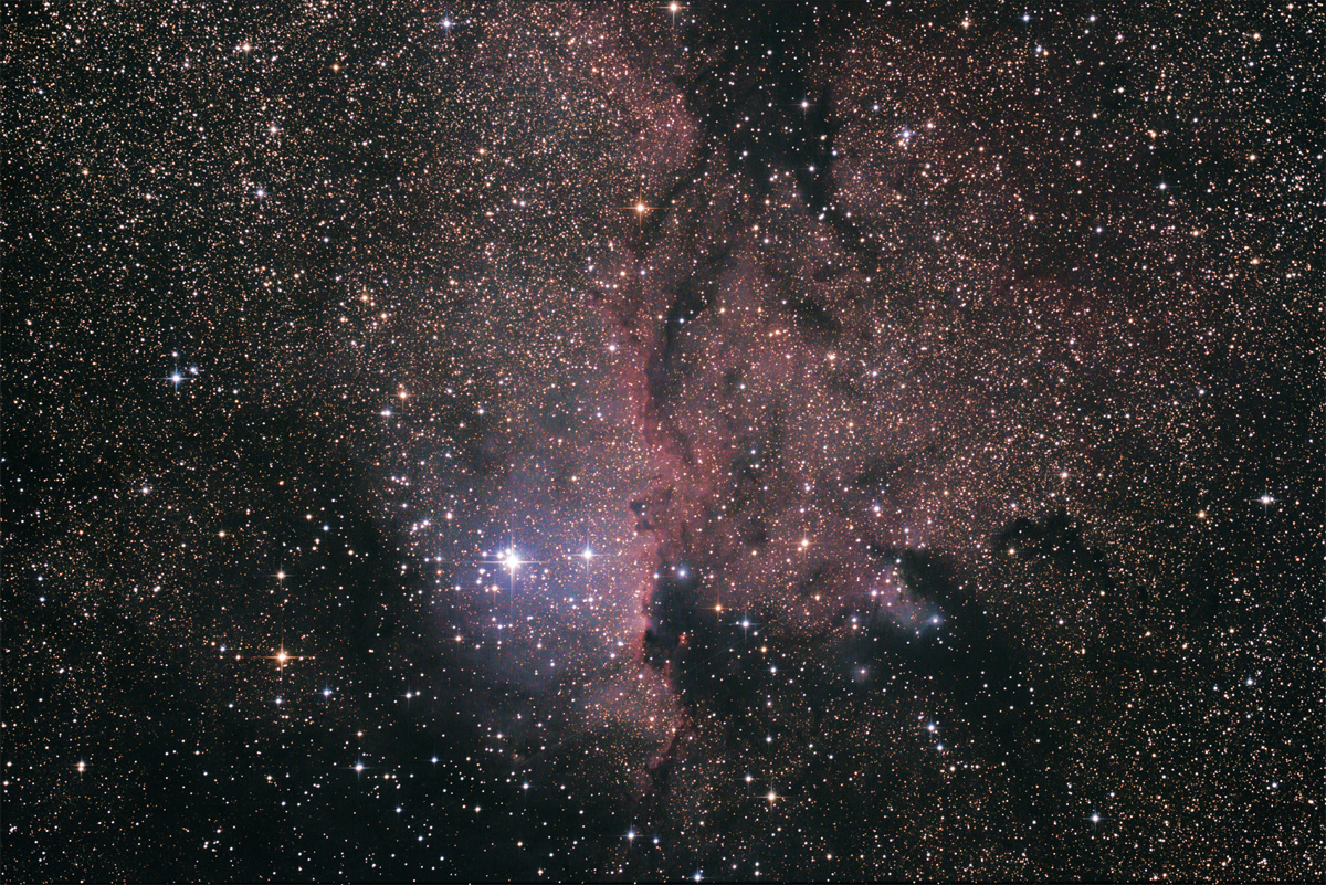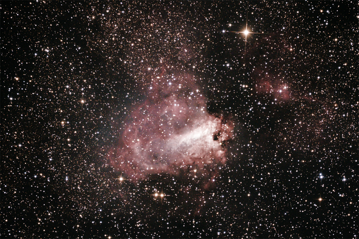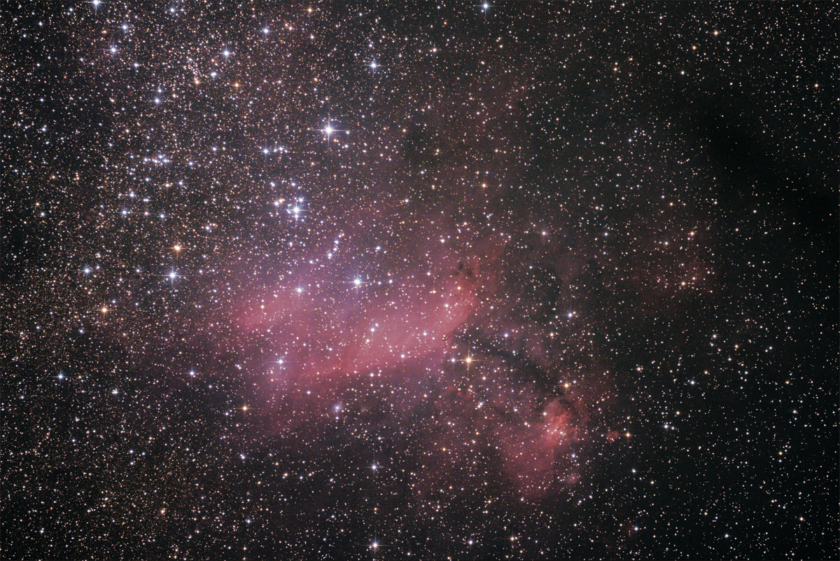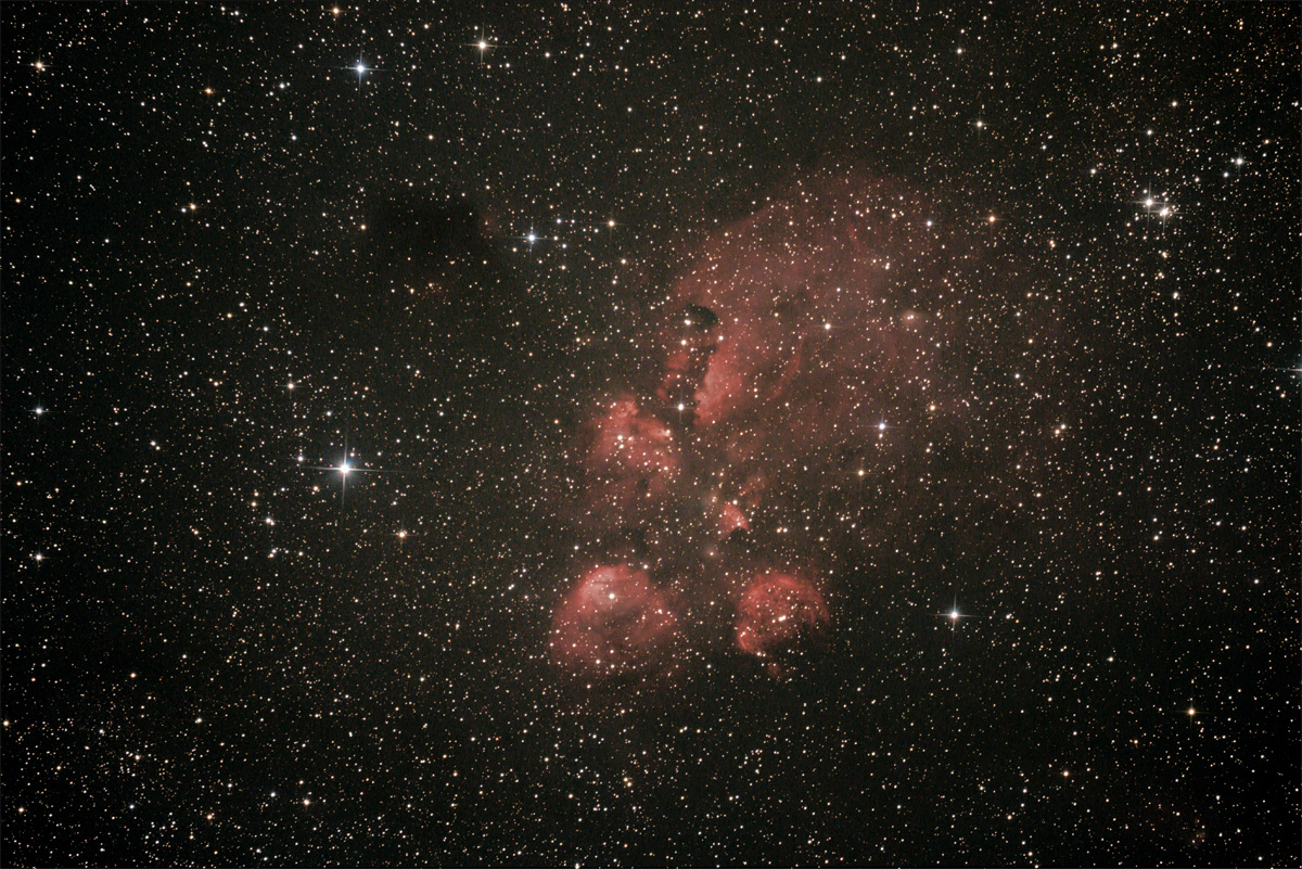 Bei diesen Nebeln, wie auch schon bei Eta Carinae, zeigt die EOS 350D klare Vorteile gegenüber der 70D. Letztere gibt die Nebel beeindruckend, aber ohne markante Farbe wieder -- offenbar ist die Empfindlichkeit im roten und grünen Bereich des Spektrums ähnlich, so dass die Farben verblassen. Die ältere 350D schafft, obwohl unmodifiziert, den roten Anteil des Spektrums besser.