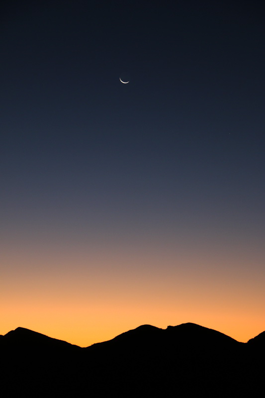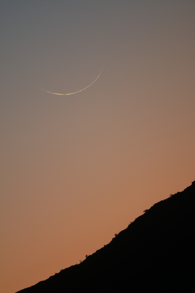 Am nächsten Abend (30. Mai) erleben wir etwas, das in unseren Breiten unmöglich ist: Eine knapp zwei Tage junge Mondsichel auf komplett dunklem Himmel. Das geht nur in niederen Breiten dank der sehr kurzen Dämmerung.