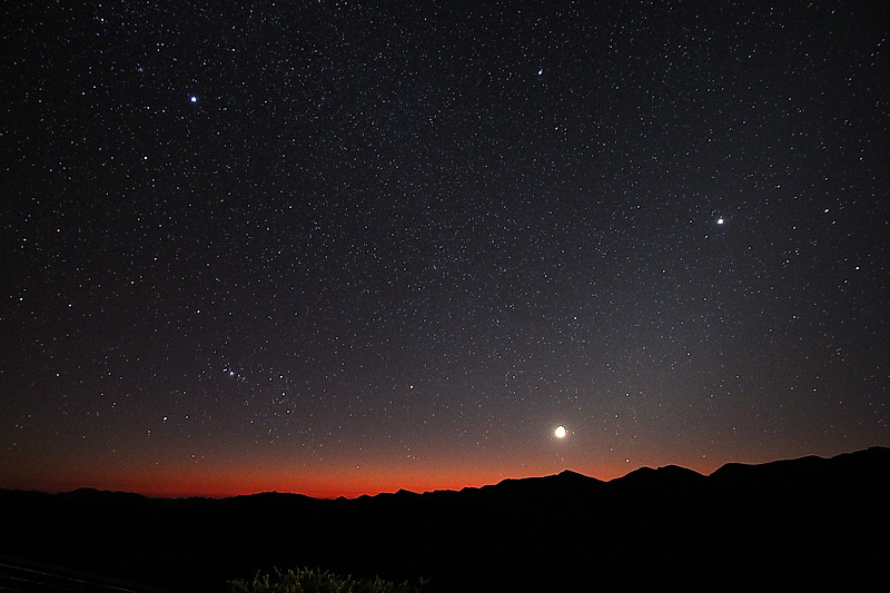 Während viele bei einer Reise nach Hakos nicht an Planeten denken, denken alle an den Mond -- sie wählen den Termin so, dass der Mond ja nicht am Himmel steht. Sein helles Licht würde die Brillanz des dunklen Wüstenhimmels zunichte machen. Doch ganz ohne Mond geht es nicht. Auf 23° südlicher Breite steht die Ekliptik zu manchen Zeiten (Juni) am Abend und Morgen senkrecht zum Horizont. Derart steil bedeutet, dass der Mond wirklich nur ein bis zwei Tage rund um Neumond gar nicht zu sehen ist.