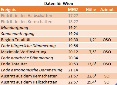 Die nächste Mondfinsternis für Wien: Partielle Mondfinsternis, 28. August 2026, teilweise zu sehen. Die nächste totale Mondfinsternis, die von Wien aus zumindest in der partiellen und totalen Phase in vollem Verlauf zu sehen sein wird, findet erst am 31. Dezember 2028 statt! © Wiener Arbeitsgemeinschaft für Astronomie. Jede Wiedergabe von Text oder Grafiken aus dieser Seite bedarf der vorherigen schriftlichen Erlaubnis und ist auch dann nur unter Angabe der Quelle (Autor und Organisation) gestattet. |