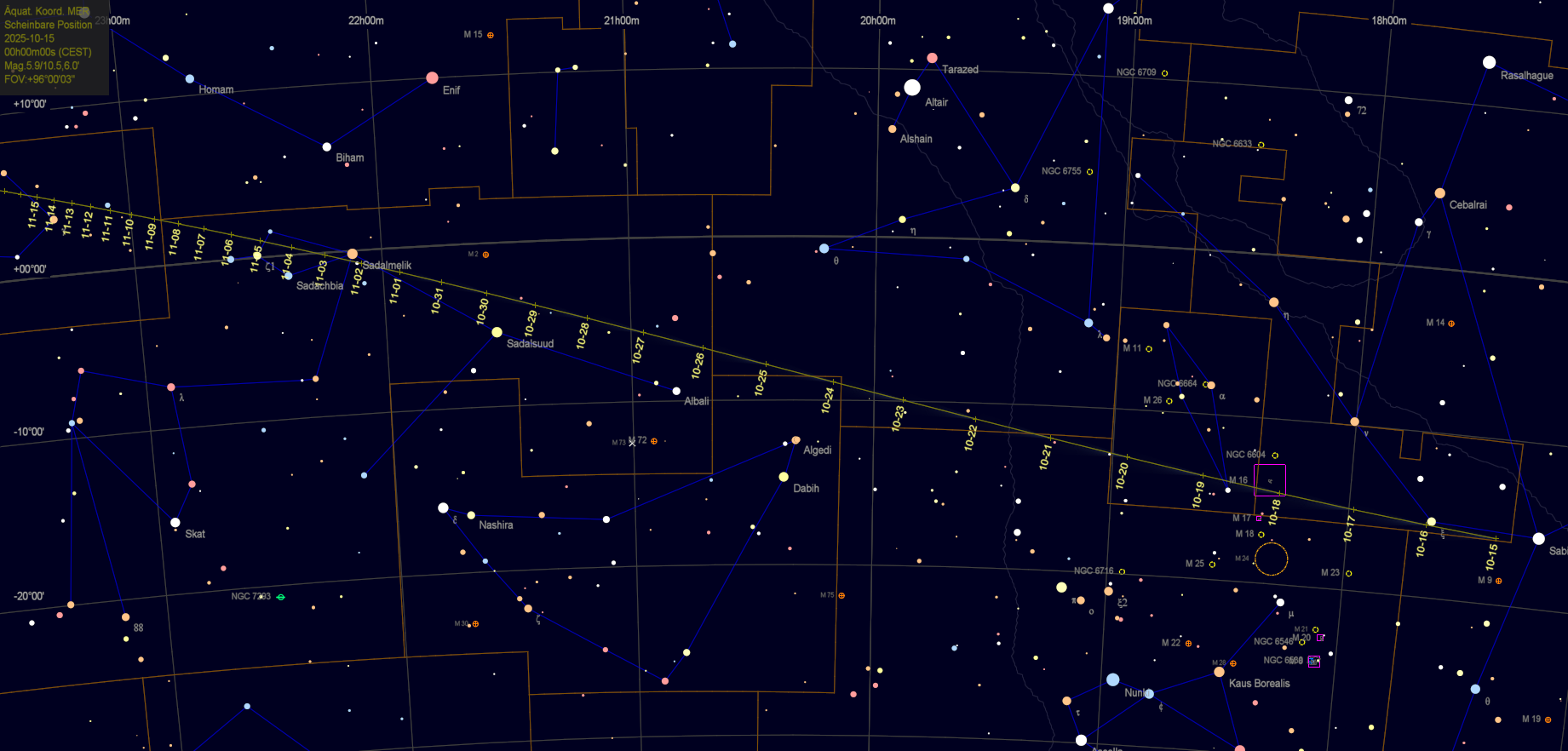 Suchkarten Aktuelle Suchkarten werden zeitnah zur Verfügung gestellt. Die hier veröffentlichten Karten basieren auf Bahndaten zum Redaktionszeitpunkt, über einen längeren Zeitraum können sich Abweichungen ergeben. Die Suchkarten gelten jeweils für 0 Uhr Lokalzeit und wurden erstellt mit Cartes du Ciel. Die Suchkarten dienen nur zur Orientierung. Zum Auffinden oder einstellen am Fernrohr empfehlen wir die Verwendung aktueller Smartphone- oder Tablet-Apps mit aktualisierten Bahndaten des Kometen. |