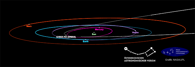 Komet SWAN umkreist die Sonne auf einer langperiodischen Bahn und erreichte am 12. September 2025 seinen sonnennächsten Punkt (Perihel) in einer Distanz von ca. 0,5 Astronomischen Einheiten von der Sonne, das ist etwas mehr als die Merkurdistanz. Die Bahn ist nur gering zur Ekliptik geneigt. Referenzen: