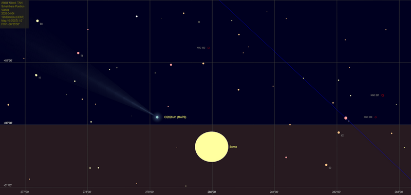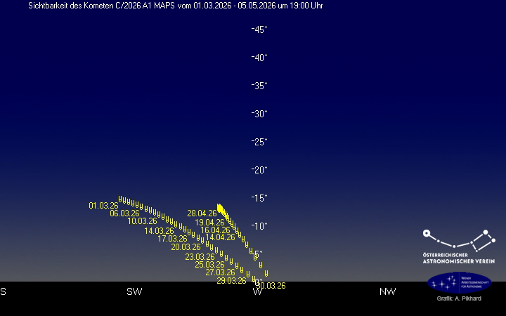 Sichtbarkeit in Mitteleuropa Komet C/2026 A1 (MAPS) ist vermutlich ein Kreutz-Komet mittlerer Größe. Er könnte heller werden als C/2011 W3 (Lovejoy), aber nicht so hell wie C/1965 S1 (Ikeya-Seki). Komet C/2026 A1 könnte im Perihel sehr hell werden und auch einen langen Schweif entwickeln. Diese Prognose ist natürlich sehr unsicher. Es lohnt, in der hellen Abenddämmerung des 4. und 5. April kurz nach Sonnenuntergang im Westen nach dem Kometen Ausschau zu halten. Mit steigender Sonnenentfernung wird der Komet sehr rasch schwächer.