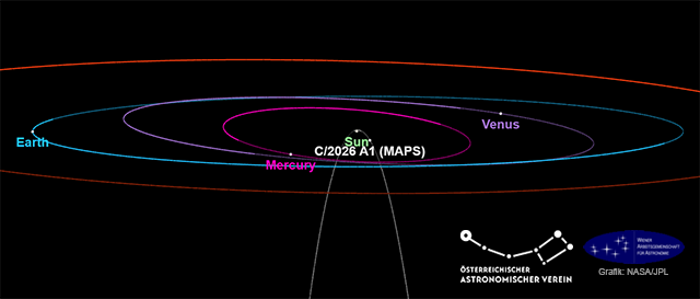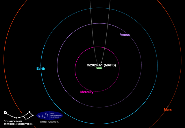 Der Komet mit der offiziellen Bezeichnung C/2026 A1 (MAPS) wurde am 13. Jänner 2026 von Alain Maury, Florian Signoret, Georges Attard (MAPS survey) entdeckt. MAPS (Maury, Attard, Parrott, Signoret) ist ein von vier Amateurastronomen gegründetes Beobachtungsprogramm zur Entdeckung erdnaher Asteroiden mit Hilfe eines neuen, "synthetic tracking" genannten Methode. Der Komet ist ein Sonnenkreuzer (Sun grazer) der Kreutz-Gruppe. Da er der Sonne am 4. April 2026 auf nur rund 820.000 Kilometer nahe kommt, könnte er kurz nach seinem Periheldurchgang - wenn er ihn übersteht - für sehr kurze Zeit sehr hell werden. Komet MAPS ist ein Fragment des großen Kometen von 1106 (X/1106 C1), der für mehrere Wochen in Europa, Asien und auch Ägypten beobachtet wurde und in mehrere Stücke zerbrochen ist. Viele dieser Bruchstücke wurden bei einer sonnenahen Wiederkehr beobachtet, wie etwa der große Komet von 1843 (C/1843 D1). Bahn: