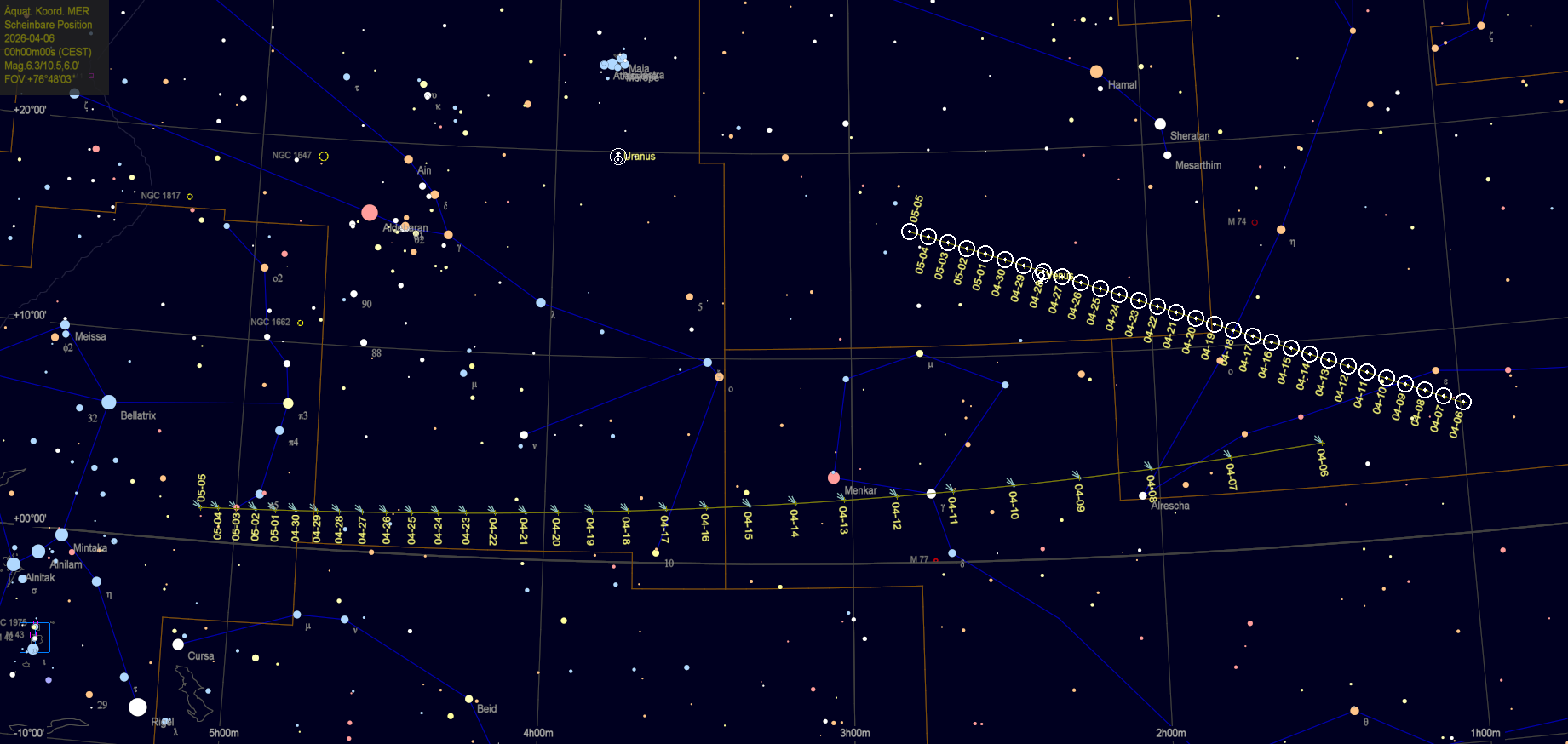 Meldungen, wonach der Komet am Tag des Perihels mit freiem Auge bei Tag zu sehen sein wird, sind als Unsinn einzustufen. Er steht viel zu nahe bei der Sonne. Es sei ausdrücklich davor gewarnt, ohne geeigneten Schutz direkt zur Sonne zu blicken! So steil, wie die scheinbare Helligkeit des Kometen vor dem Perihel ansteigt, so steil fällt sie danach auch wieder ab. Sobald Komet MAPS genügend Winkelabstand von der Sonne gewonnen hat, ist seine scheinbare Helligkeit so weit gesunken, dass er kein auffälliges Objekt mehr darstellt - sofern er die enge Perihelpassage überhaupt übersteht, ohne sich gänzlich aufzulösen. Suchkarten Aktuelle Suchkarten werden zeitnah zur Verfügung gestellt. Die hier veröffentlichten Karten basieren auf Bahndaten zum Redaktionszeitpunkt, über einen längeren Zeitraum können sich Abweichungen ergeben. Die Suchkarten gelten jeweils für 0 Uhr Lokalzeit und wurden erstellt mit Cartes du Ciel. Die Suchkarten dienen nur zur Orientierung. Zum Auffinden oder einstellen am Fernrohr empfehlen wir die Verwendung aktueller Smartphone- oder Tablet-Apps mit aktualisierten Bahndaten des Kometen. Spezieller Beobachtungstipp Gute Chancen zur Beobachtung von Komet C/2026 A1 (MAPS) im Perihel bestehen mit den Live-Bildern des Sonnenobservatoriums SOHO (soho.nascom.nasa.gov, und zwar mit den Koronografen LASCO C2 (innere Korona) und LASCO C3 (äußere Korona): |